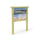 Al igual que con el modelo básico, se ofrecen diversas opciones para la personalización y el anclaje, incluyendo la elección entre patas extendidas para enterrar o soportes de acero galvanizado para una instalación más permanente. La viga inferior de 7×4,5 cm completa el recerco del panel, asegurando un soporte firme para el vinilo informativo, ya sea provisto por el cliente o preparado por nosotros.
